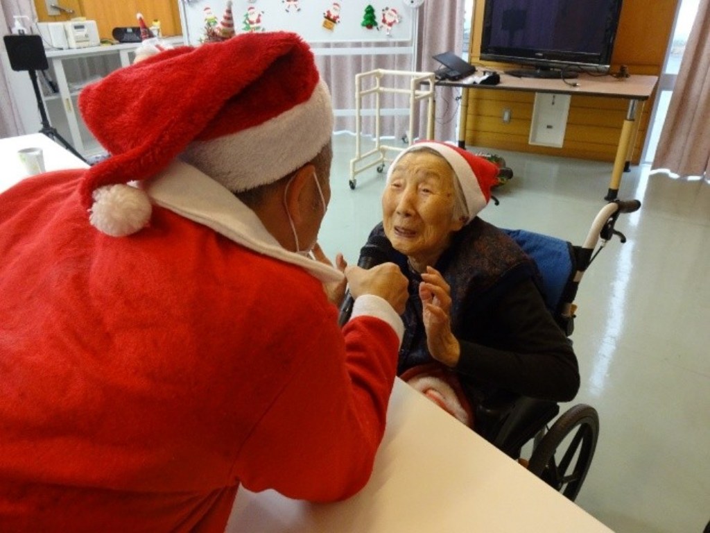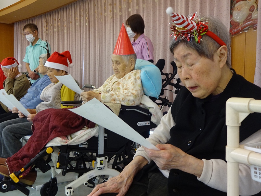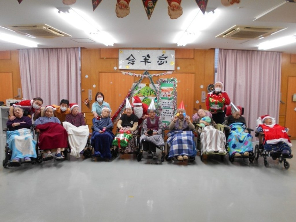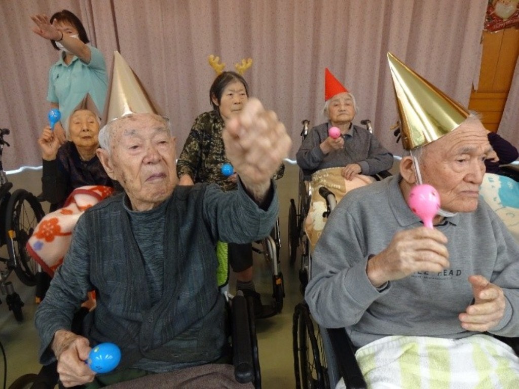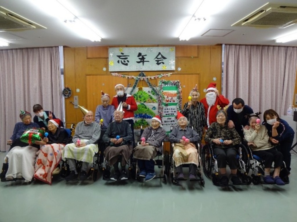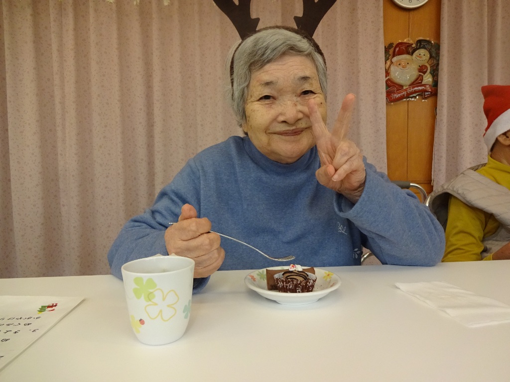「本日はクリスマス忘年会を開催!クリスマス体操で体を動かし、職員の余興で大盛り上がりした後は、甘いケーキでティータイム。