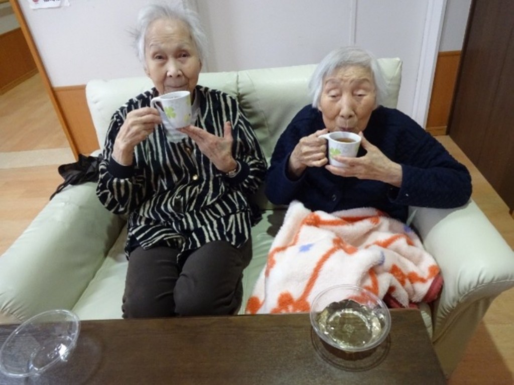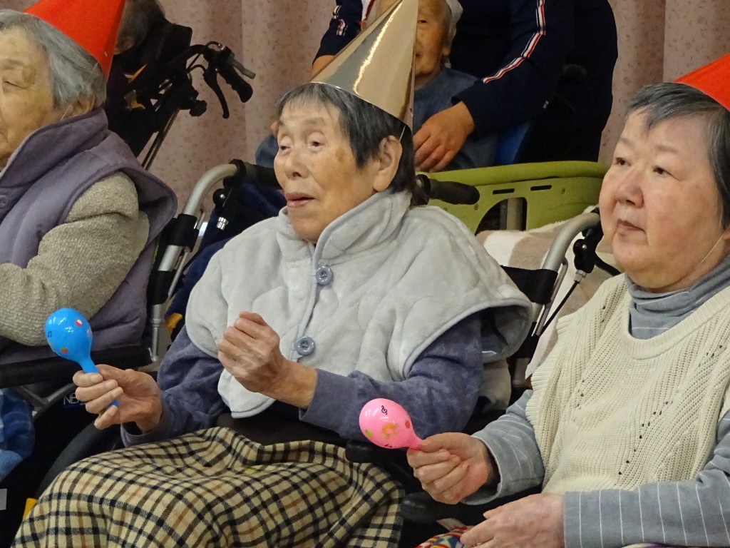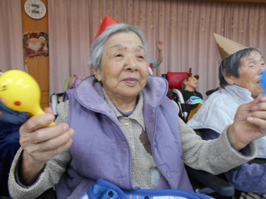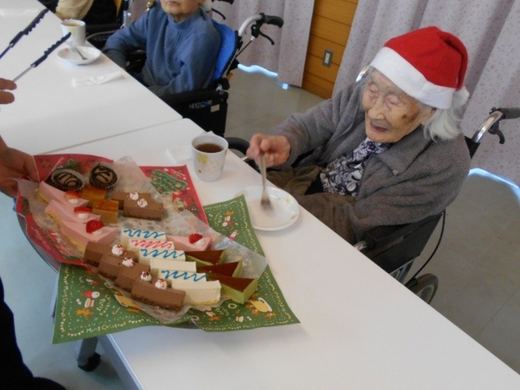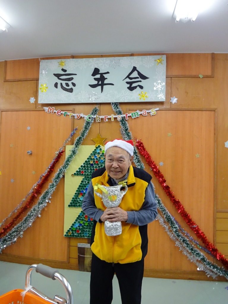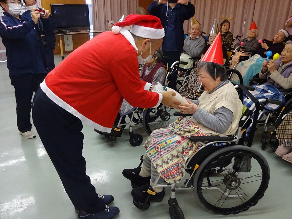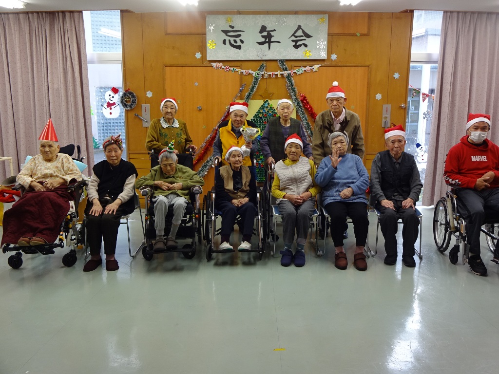 「本日はクリスマス忘年会を開催!クリスマス体操で体を動かし、職員の余興で大盛り上がりした後は、甘いケーキでティータイム。