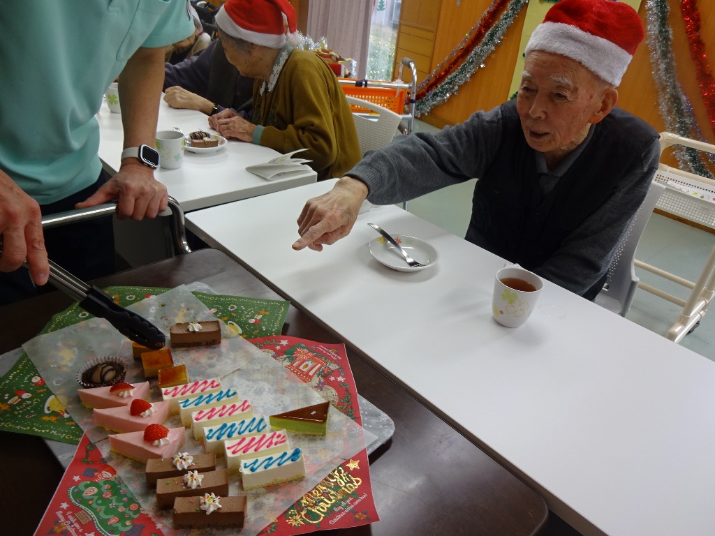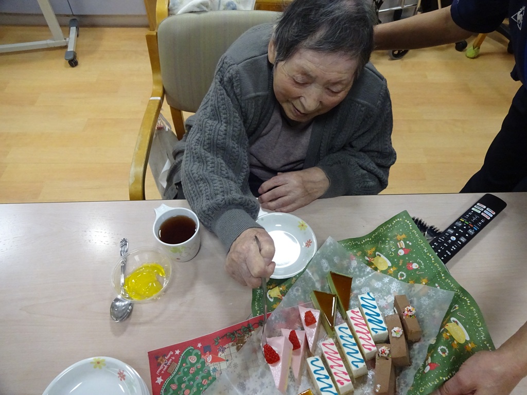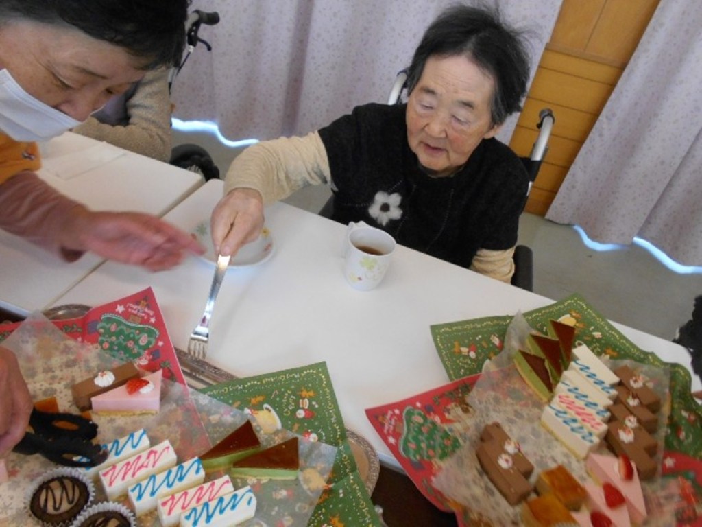 「今日は待ちに待ったクリスマス忘年会!体を動かし余興を楽しんだ後は、お楽しみのプレゼントタイム。豪華なケーキバイキングも登場し、『どれにしようかしら』と皆さま大変喜ばれていました。(^^)」