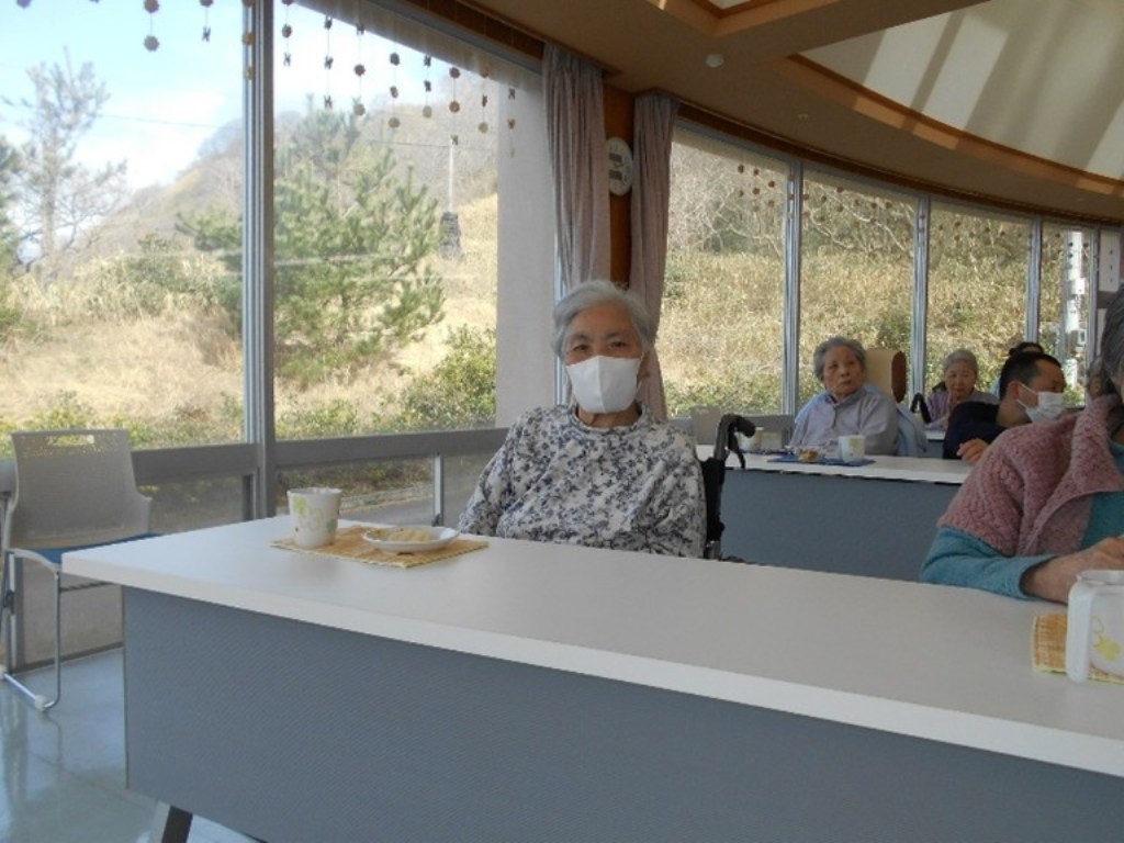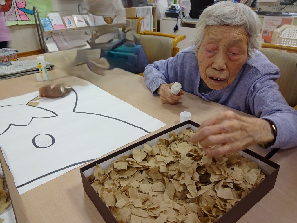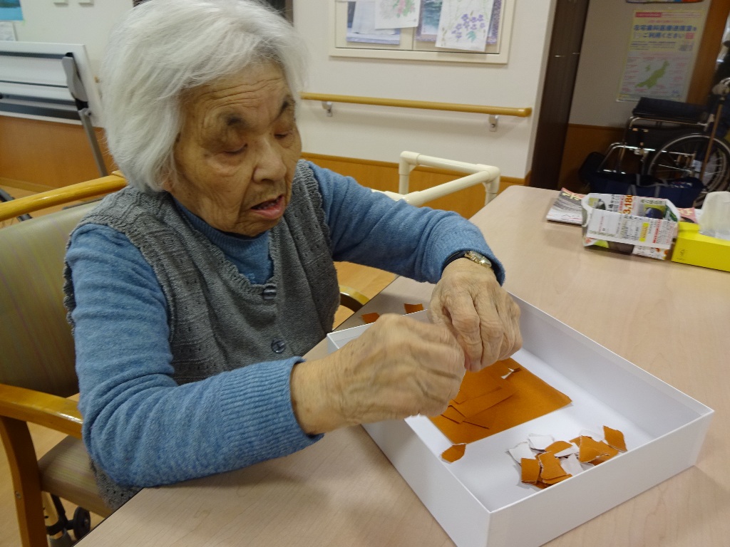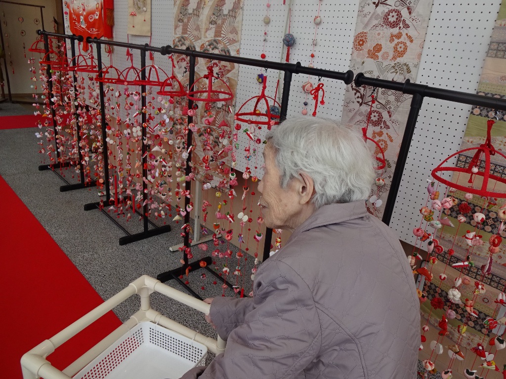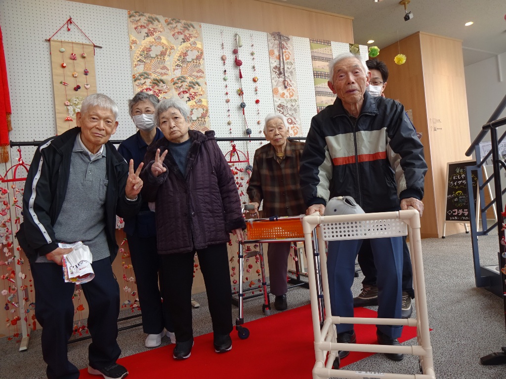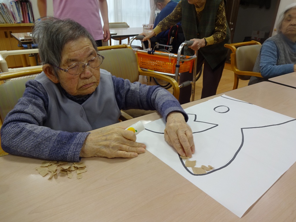 春の外出行事で西山ふるさと公苑を訪れ、つるし雛を見学してまいりました。皆様、季節の風物詩を熱心に鑑賞されていました。現在は余暇活動として干支の貼り絵を制作しており、完成に向けて皆様一生懸命に取り組まれています。
